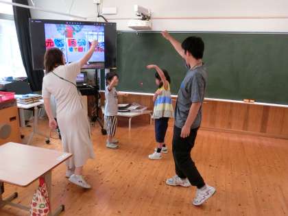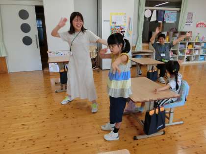 きずな運動会に向けて(3組) 公開日 2023/09/27 更新日 2023/09/27 3組 きずな運動会の練習が少しずつ始まってきています。3組では、全校ダンスの映像を見ながら動きを確認しています。一度に全部は覚えられませんが、体のどの部分を伸ばすのか、どんなふうに曲げるのか先生たちの一緒に頑張って練習しています。