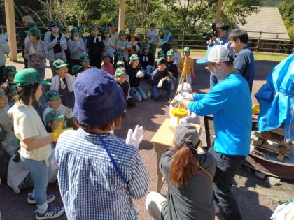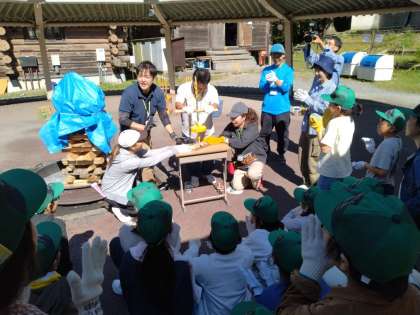 花背山の家 7 公開日 2023/10/02 更新日 2023/10/02 5年生 いよいよ火起こしのスタートです。みんなで協力しないと火は起こせません。まずは、所員さんや先生たちのデモンストレーションをよく見て、イメージをもちました。