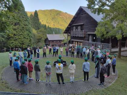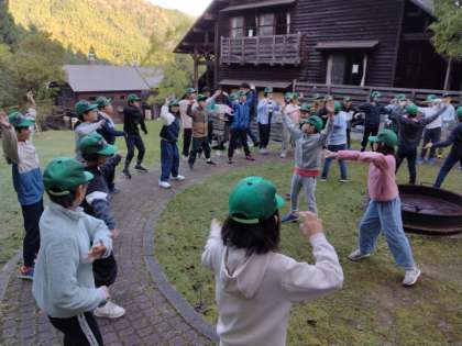 朝の集いでは、二日目のめあて[協力][信頼]を確認して、身体を動かしました。肌寒い朝でしたが、元気に過ごせそうです。
