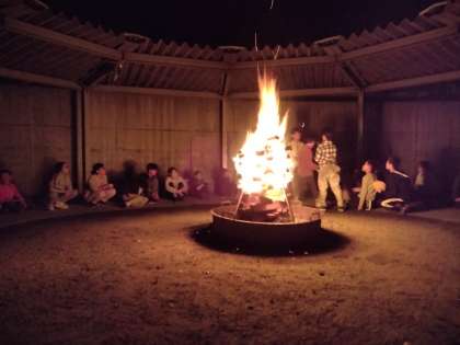 キャンプファイヤーの大きな火を囲むと、「火」のもつ明るさ、暖かさなど、野外炊事のとき以上に、より強く感じることができます。