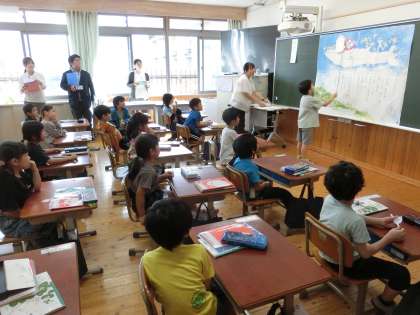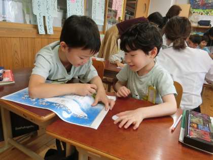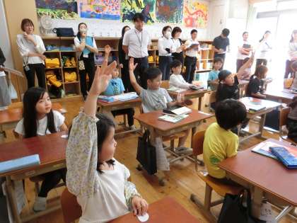 授業研究会(1年 国語科)を行いました。「くじらぐも」を読み、くじらぐもに乗って空を旅する場面で、どんなことをしたり話したりしているかを想像しました。人物になり切って行動したり話したりする姿が見られました。空の旅はとても楽しいようで、みんな笑顔でした。空の上にいる気分になるために、いつもは乗ってはいけない椅子に乗って音読もしました。