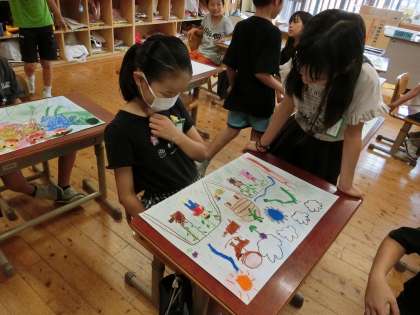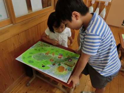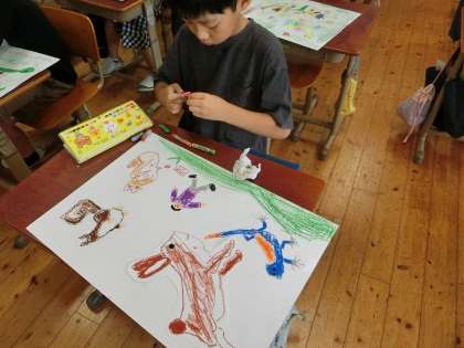 2組は「ひみつのえんそく」という本を読みました。主人公のそうたくんが、たぬき、うさぎ、とかげ、りすと一緒に、森の遊園地に遠足に行くすてきなお話です。「へびのジェットコースター」「しかのメリーゴーランド」など楽しい乗り物がたくさん出てきます。それらに乗って遊んでいる場面を想像して描いていました。