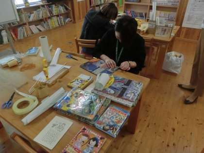 学校司書の先生からいろいろな修理の仕方を教わりながら、読書センターの傷んだ本の修繕や新しい本の保護をしてもらいました。