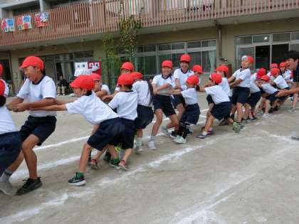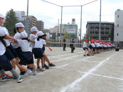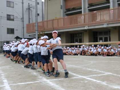 綱引きは、初めてする子もいて、力の入れ具合が難しかったようですが、腰を落として力いっぱいに綱を引きました。「オーエス!オーエス!」声を出して、頑張りました。
