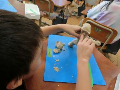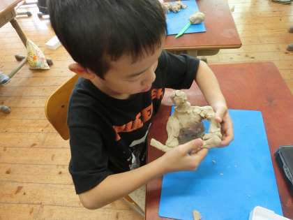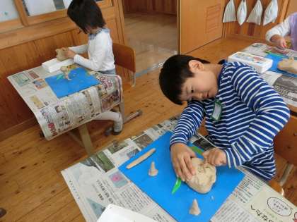 楽しかった「きずな運動会」。力いっぱい頑張った思い出を図画工作の時間に粘土で表現しました。「ジャンボリーミッキーのミッキーポーズがいいな」「棒リレーで、力を合わせて走っているところを作ろう」など表したい思い出がいっぱいでした。粘土をひねり出し、顔の表情や力強い腕、足の動きを表現していました。