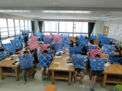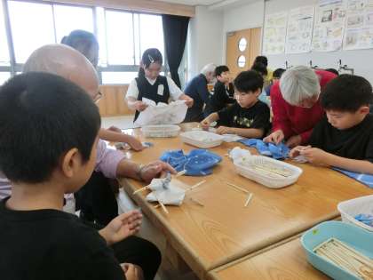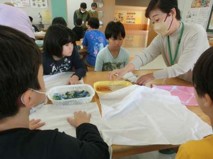 総合「みらい」の学習で、京鹿の子絞振興協同組合の皆さんにお越しいただき、絞り染め体験学習を行いました。京鹿の子絞体験では白い布にビー玉や洗濯ばさみを輪ゴムでしぼりつけて、模様がつくようにしていきます。その布を色がつく薬の入った鍋で煮立て、絞っていた用具をほどいていくと美しい模様が浮かび上がります。それぞれ、赤・青の色を付けて、美しい京鹿の子絞を仕上げることができました。伝統工芸師の皆さんのやさしい言葉がけや技術に感動しながら、子どもたちも一生懸命取り組みました。手取り足取り教えていただきながら、伝統工芸を通して京都のよさを自分の手で体験できる素晴らしい機会になりました。