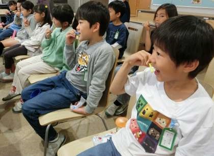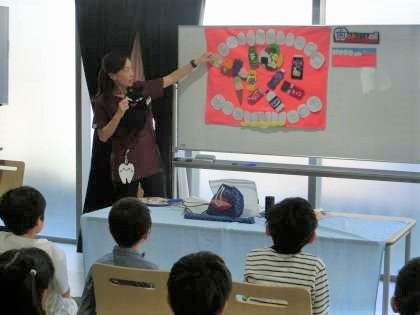歯医者さん、歯科衛生士さんに来ていただき、歯を大切にするためのお話を聞きました。歯科衛生士さんが手作りされたお人形などを使って、歯磨きをしないと口の中がばい菌でいっぱいになってしまうことを教えてくださいました。そして、歯の磨き方を教えてもらい、さっそくきれいに磨こうと頑張っていました。毎日の習慣にしていきたいです。