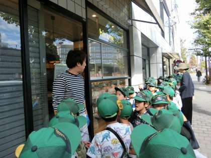生活科の学習で、久しぶりに町探検に行きました。前にいったのは、6月の暑い中でした。銅駝公園に行くと、葉っぱが茶色や黄色に変わっていて、セミの鳴き声も聞こえず、秋らしさを感じていました。パン屋さんの前を通ると、ホットドックやカレーパンなど美味しそうなパンがいっぱい並んでいました。お店の人におすすめのパンを聞くと「ドーナツができたてだよ。」と教えてもらいました。まだまだ朝の早い時間でしたが、みんなお腹が空いて食べたくなったようです。