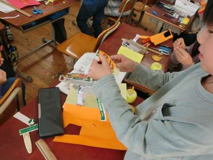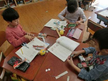 国語科の学習で「馬のおもちゃの作り方」という説明文の学習が始まりました。「みんなで作ろう。」と図画工作の時間に馬のおもちゃ作りに挑戦しました。一生懸命に説明文を読みながら、長さを測ったり、足や体の形を切ったり、のりやホチキスでとめたりして頑張っていました。出来上がった時には「やったあ。馬が立ったよ。」と歓声が上がっていました。お忙しいところ箱をご用意いただいてありがとうございました。