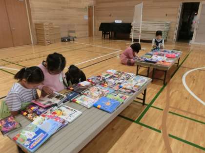 子どもたちは、体育館中にずらっと並んだ本に、「うわぁ!」「すごいっ!」と喜びの声を上げ、おもしろそうな題名の本、お気に入りのシリーズ本、表紙がきれいな本、など、夢中で手にとっています。