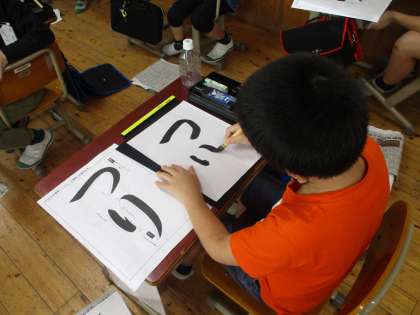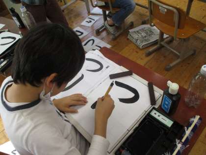 3年生になって毛筆の学習が始まり、子どもたちは少しずつ筆の使い方に慣れてきたところです。今までは、漢字一文字を半紙に大きく書いていましたが、今回は初めてひらがな二文字にチャレンジしました。書く前は、「漢字よりも簡単そう。」と思っていた子もいたようですが,実際に書いてみると、思っていたよりも大きくなってしまったり,逆に小さくなってしまったりとなかなか難しかったようです。お手本をよく見て納得いく字が書けるまで何度も練習をしている姿も見られました。