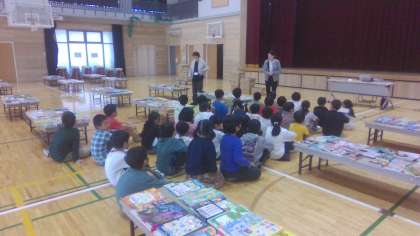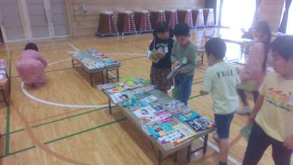 8日(水)3校時に選書会がありました。体育館がまるで本屋さんのように大変身していて、いつもの読書センターにはない、新しい本をじっくり見て、読んで選ぶことができました。自分が選んだ1冊が購入されるかもしれないということで、みんな一冊一冊を吟味しながら選んでいました。体育館に並べられた本はどれも魅力的な本ばかりで、『いい本がたくさんあって選びきれない!』という声も多く聞こえていました。みんな新しい本との出会いにわくわくしながら、選書会を楽しんでいました。