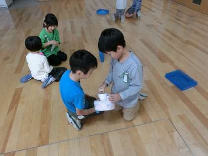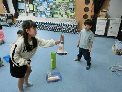 生活科「あそんで ためして くふうして」の学習でがんばって作ってきたおもちゃを使って、みんなで遊びました。「とばす」「まわす」「ひねる」「ひっぱる」など、いろいろな工夫を考えました。どのおもちゃも、それぞれの工夫があって、とても素敵で、みんなで遊びを楽しみました。