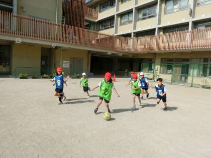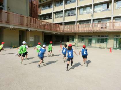 体育の時間にボールけりゲームをしています。足でボールをコントロールするボールげりゲームは、パスゲームよりも難しいですが、みんな積極的にボールに向かって、パスを出したり、シュートをねらったりしています。チームの友達と声をかけあってがんばっています。