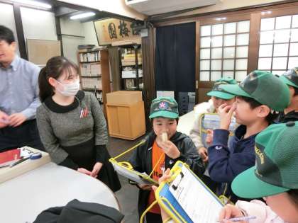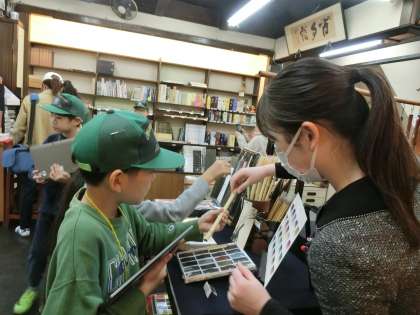 古梅園さんでは、お店の中を見学させていただき、インタビューにも答えていただいていただきました。店の前には墨で作られた兜、大きなすずりなどが飾られていて実際に近くで見せていただきました。また、筆には馬やいたちなどなど様々な動物の毛が使われており、昔の人々は命をいただいてまで文字を書くことにこだわっていたことなどを教えていただきました。お店が大変長く続いていることから「昔のものがここまで大事に残されているなんてすごい」と子どもたちは話していました。