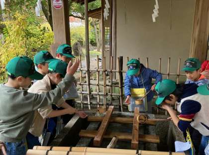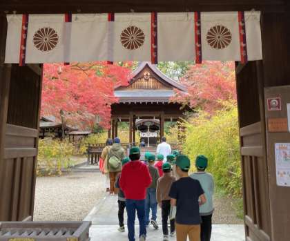 梨木神社境内を見学させてもらいました。境内の木々は赤く色づき、美しい景色に子どもたちは感動していました。季節ごとに変わる美しい萩やもみじについてや明治時代から大切に手入れをしてきた建物について教えていただきました。自然だけでなく京都三名水の染井の井戸、お参りの作法なども見せていただきました。紅葉の時期も大変美しいですが、萩の名所ということで、子どもたちは「萩の咲く季節にもまた来たいな」と話していました。