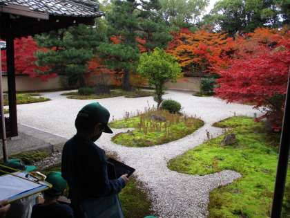 廬山寺さんでは、境内のお庭を見ながらお話を聞かせていただきました。お庭は6月には桔梗、秋には紅葉など季節ごとに違った景色が楽しめることを教えていただきました。また、紫式部のゆかりの地ということで、境内には絵巻などがたくさん飾られていて、子どもたちは興味深そうに眺めていました。心落ち着く一時を過ごせて大変満足そうでした。