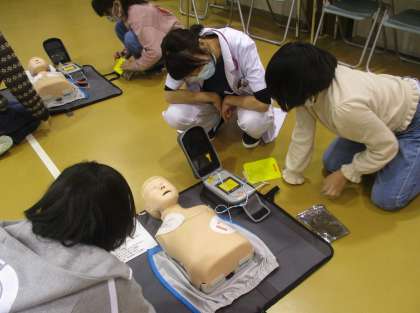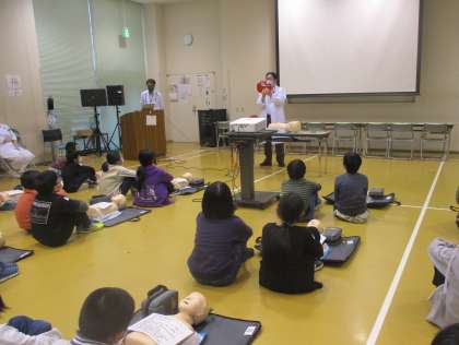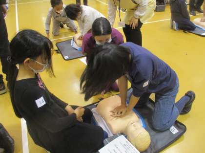 「京あんしんこども館」に行き、子ども救命救急講習を受けてきました。救命救急講習では、実際に医療現場で働いておられる方からお話を聞かせていただきました。なぜ、この救命救急講習を受けるのかを聞いた後、聴診器を用いて心音を聞き「命」を感じることから学習が始まりました。そして、命を救うために、いち早く行動することが大切だと知りました。そこで、子どもたちは、胸部圧迫や人工呼吸の方法、AEDの使い方について学び、実際に人形で実践しました。実践してみると、思っていた以上に胸部圧迫のしんどさや難しさを体感していました。