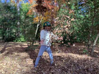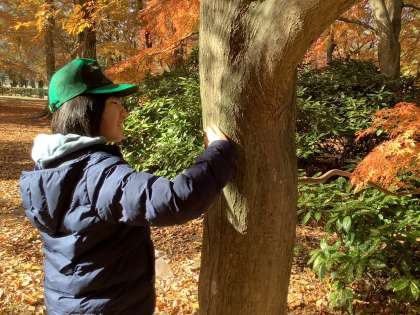 着いたところは御所の森。小さいころ好きだった森の本棚。赤や黄色,オレンジなど色とりどりの鮮やかな葉っぱ。自分の顔よりも大きい葉っぱや面白い形の木の枝。