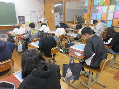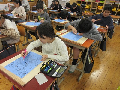 今回は「心に残っている出来事・場面」をテーマに、一版多色刷りの木版画に挑戦しています。場面を選んで、構図を考えて下絵を完成させました。今日から、彫刻刀を使って彫る工程に入りました。彫刻刀の使い方を確認し、安全に気を付けて集中してゆっくり彫り進めています。