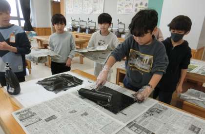 版画に取り組んでいます。この日は、彫った版にインクをつけて刷ります。むらなくまんべんなくインクがついたかどうかを確かめながら進めました。みんな真剣な表情でした。