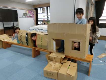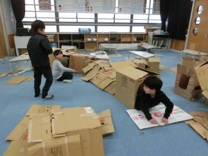 図画工作科の学習で、段ボールの特徴を生かして、つないだり、切ったり、穴を開けたり、囲んだりしながら、考えたことや思い付いたことを形にしました。手や体全体の感覚などを存分に働かせて楽しみました。できた形や作品を見せ合って、面白さや楽しさなど見付けたことや感じたことを伝え合おう姿も見られました。