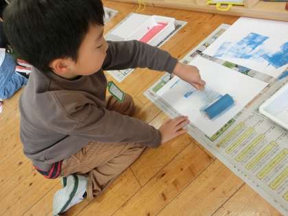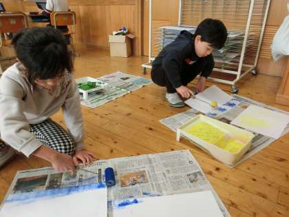 図画工作科「たのしく うつして」(2年) 公開日 2024/01/12 更新日 2024/01/12 2年生 図画工作科の「たのしく うつして」の学習で、ローラ—を使って絵を描きました。今回は、背景になる部分を作りました。ローラーの転がし方を工夫して、海やジャングル、空など、いろいろな景色を表現していました。子どもたちは「きれい!」「版画をするのが楽しみだな」と話しながら取り組んでいました。