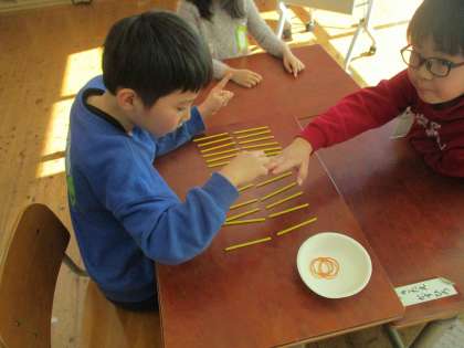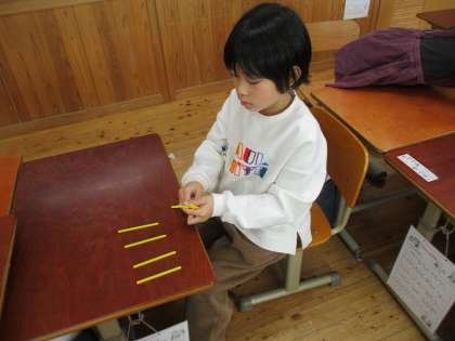 算数科「大きいかず」(1年) 公開日 2024/01/18 更新日 2024/01/18 1年生 算数科では「大きいかず」の学習が始まりました。 数え棒を使って、20をこえる数の仕組みについて考えました。 10のまとまりを作ると、数え間違いをしにくいことに気付いて、 グループで協力しながら、数え棒の本数を数えられました。