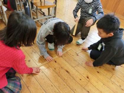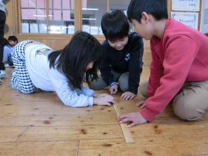 教室の長さは何cm?(2年) 公開日 2024/02/01 更新日 2024/02/01 2年生 算数科の「100cmをこえる長さ」の学習で、教室の長さを測ることに挑戦しました。友達と協力しながら、ものさしをつなげて一生懸命調べていました。「予想よりも長い!」「測るのが大変だ」と呟きながら取り組んでいました。