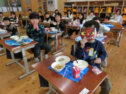 給食の様子(1年) 公開日 2024/02/06 更新日 2024/02/06 学校の様子 2月2日は節分。給食にもいわしや煎り豆が出たりしました。子どもたちは、骨を上手に取っていわしを食べたり、煎り豆の数を数えながら年の数だけ食べたりしました。