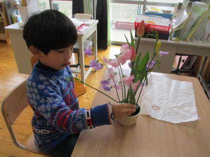 御所東の地域で生け花教室を開かれている松本先生を講師に招き、生け花体験を行いました。色・形・におい・さわりごこちなど、言葉で言い表すのが難しいと思うようなお花の”すてき”を感じることができました。その思いを何とか言葉にできないかとみんなで考える時間ももちましたが、改めて「言葉にすることが難しいこともあるんだなあ」と話していました。