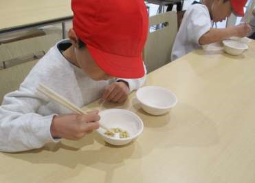 給食週間「豆つまみ大会」 公開日 2024/02/16 更新日 2024/02/16 2年生 今週から給食週間が始まり、休み時間に「豆つまみ大会」がありました。つるつるのお豆はつるっとすべってしまうようで、お箸を上手に使ってそうっと運んでいました。「力を入れすぎない方がうまくつかめるよ」などコツをつかんでがんばっていました。