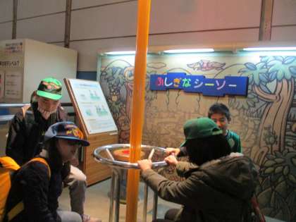 展示見学では自由に見学する時間をとりました。空気が力に変わる“空気砲”、生息環境を再現している魚の水槽、湿度の違いによって体感温度が変わる「砂漠の夏」と「京都の夏」の比較・・・など、子どもたちはそれぞれの興味がおもむくままに存分に“不思議”を楽しむことができました。