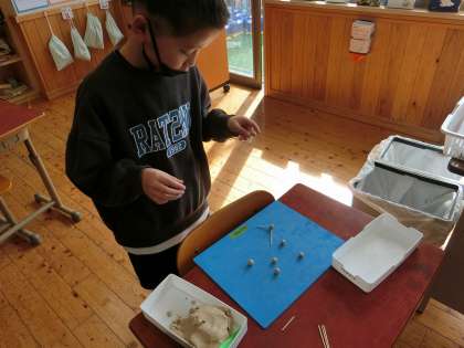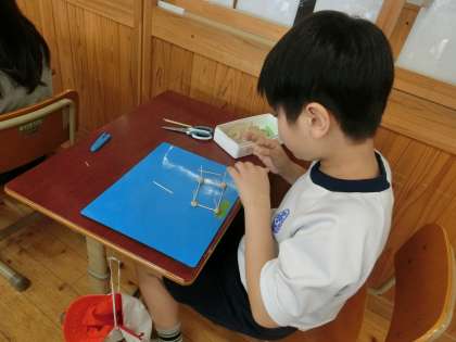 算数科では、「はこの形」の学習をしています。この日は、竹ひごと粘土を使ってはこの形を作りました。辺の数や長さ、頂点の数を確認しながら取り組みました。はこの形を実際に作ることで、理解が深まりました。