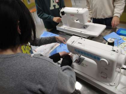 電動ではりがどんな動きをするのか息をのんでコントローラーを踏むと・・・ゆっくりと針が動き出し、子どもたちは落ち着いて真っ直ぐ縫うことができていました。