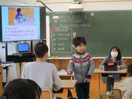 今年度最後の参観授業として『わたしのきらきらノート』の発表・交流を行いました。ロイロノートでまとめてきたノートを使って、それぞれにしっかりと発表することができました。ノートを作るために、楽しかったことや頑張ったこと、素敵な経験を振り返ってきた時間は子ども達にとってとても楽しい時間だったように思います。