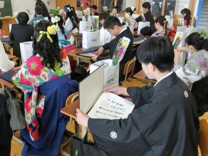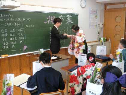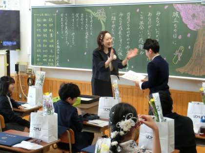 教室では、担任の先生から一人ずつに卒業証書が渡されました。みんな笑顔で、中には涙を流す子も・・・。感謝の思いを言葉にして伝えている子もいました。