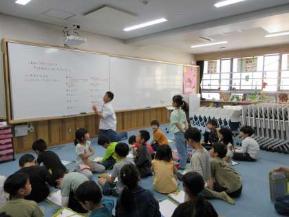 1年生のみんなのためにできることを考えて、学校たんけんを計画しています。今日は実際にいろいろな教室を見て、分かったことをみんなで共有し、一年生に教えてあげるための準備をしました。1年生と学校たんけんに行く日をとても楽しみにしている様子でした。