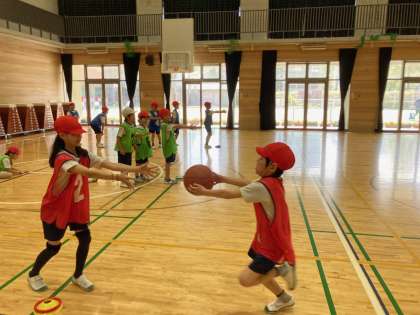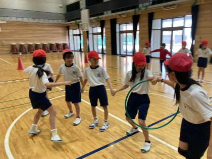 体育科『体ほぐしの運動』では、ボールやフラフープなどの用具を使って、運動の楽しさや友だちと協力するよさを知るとともに、手軽な運動を行い、体を動かす楽しさや心地よさを味わうことをめあてに行っています。ボールを使ってドリブルやパスを行ったり、フラフープを使ってできる運動を交流したりしました。また、給食当番グループごとにフラフープを送る練習をして、目標タイムを設定してクラス全員でフラフープを送る運動を行いました。上手にフラフープを送れるように、アドバイスをしたり励ましたりする姿からは体をほぐすだけでなく、心もほぐれ和やかな時間を過ごすことができました。
