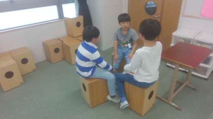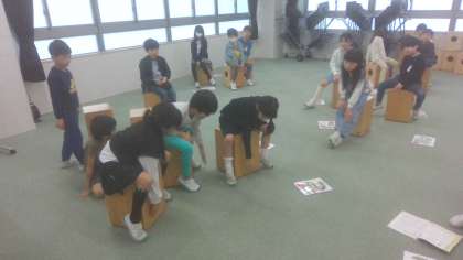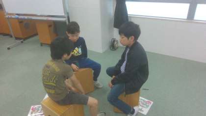音楽科「音楽で心をつなごう」の単元で、リズムを考えてまねをし合う活動を行いました。この日は音楽室に入って、カホンという楽器を使いました。いくつかのリズムの例をみんなで練習した後に、グループで挑戦してみたいリズムについて話し合い、練習しました。一人一人が打ってみたいリズムを紹介し合って、リズムを通してたかよくなることができました。
