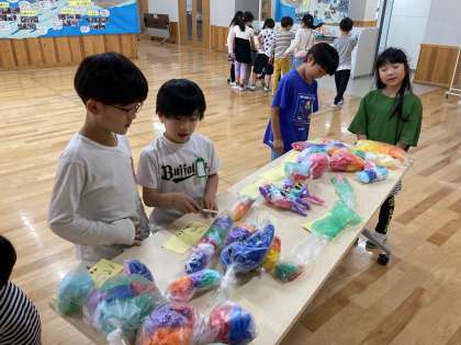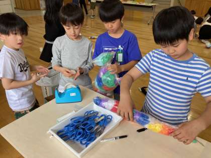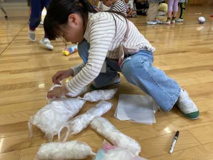 カラフルな作品に(3年) 公開日 2024/05/15 更新日 2024/05/15 3年生 図画工作科「空きようきを使って」の単元で、いろいろな色の紙を詰め込んだビニル袋を組み合わせて、楽しい「友だち」を作りました。紙の色の組み合わせや、袋のつなげ方をいろいろ試し、楽しみながら作ることができました。体に巻き付けられるほど長い蛇や、かわいらしいうさぎの親子など、思い思いの色とりどりの作品ができました。