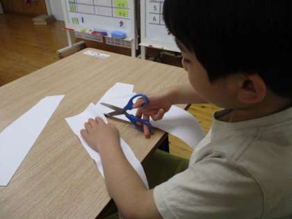2年生の図画工作科の学習では、はさみを使って創作活動を行いました。自由にランダムに切った紙を、様々な向きから見てみたり組み合わせたりしながら想像を広げて何かに見立てます。偶然できた形を何かに見立てる活動をとても楽しんでいる様子が見られました。また、友だちとも「何に見える?」と交流する中で様々な見え方が生まれることが楽しい様子でした。
