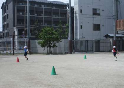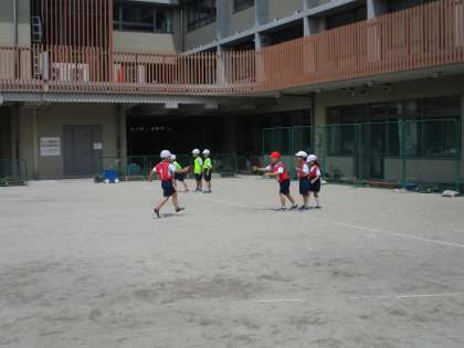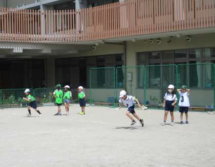 体育科「リレーあそび」の学習が始まりました。コーンをジグザクに通って、くねくねと走ってリレーをしました。バトンを次の人につなぐために、一生懸命に走ることができました。その姿を見て、互いのチームに「がんばれ!」と声援を送っている様子が素敵でした。
