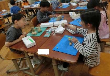 図画工作科「ねんどでのりものを作ろう」(1年生) 公開日 2024/06/04 更新日 2024/06/04 1年生 図画工作科の学習では、油粘土を使って乗り物を作りました。 タイヤで走る乗り物や空を飛ぶ乗り物など、想像を広げて発想することが出来ました。