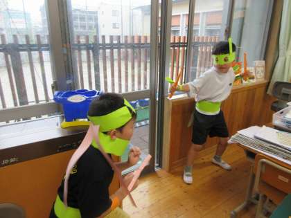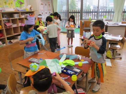 わっかでへんしん(2年) 公開日 2024/05/31 更新日 2024/05/31 2年生 図画工作科の学習で先週から取り組んでいる「わっかでへんしん」がとうとう完成しました。ねこのひげや忍者の武器など細かなところまでこだわって作っている様子が見られました。作ったわっかを身につけて、いざ変身! それぞれがなりきって交流している姿がとても微笑ましかったです。