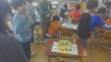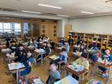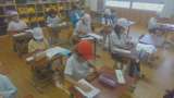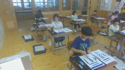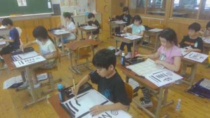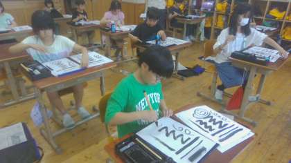 初めての毛筆の学習を行いました。「筆で書くのって鉛筆とどうちがうのかな?」「早く書いてみたいな!」と楽しみにしている子もいれば「上手に書けるかな」と不安そうにしている子もいました。 道具の準備の仕方や筆の持ち方を知った後、早速に筆に墨をつけていろいろな線を書いてみました。途中で墨をつけずに、練習用紙に細い線や太い線、ギザギザの線やうずまきなどの線を書きました。「毛筆の学習って楽しい!」「次は文字を書いてみたいな」と次の毛筆の学習が待ちきれないようでした。