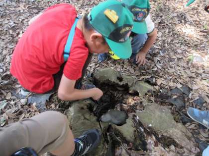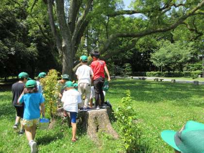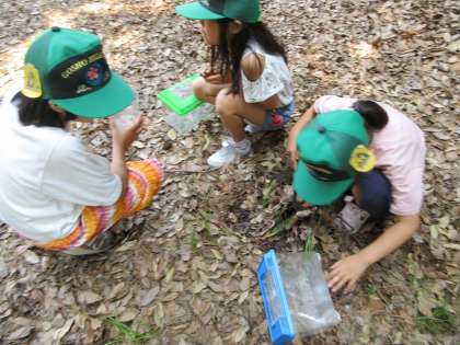 生活科の「小さな友だち」の学しゅうで、御所へ生き物を探しに行きました。探し始めると、「こんなに大きなダンゴムシがいたよ!」、「掘れば掘るほどミミズが出てくる!」と嬉しそうに探していました。暑い中でしたが、元気いっぱい活動することができました。
