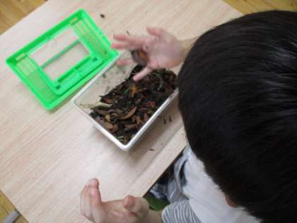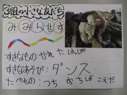 3組で一緒に過ごしている“小さな友達”のみみず。みんなで相談して名前を付けました。「(みみずの)みーやん」「のび太」「みみんせす」「ミミキュア」・・いろんな候補が出ましたが、みんなで相談して「みみんせす」に決定しました。