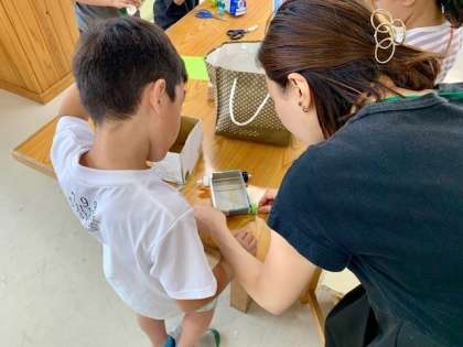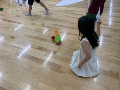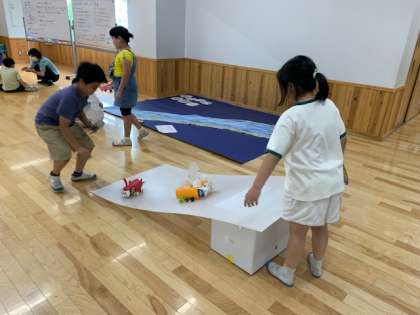 風やゴムの力で進む車を作りました。広い場所で走らせながら改良を加えました。次は仲間の作品を鑑賞します。