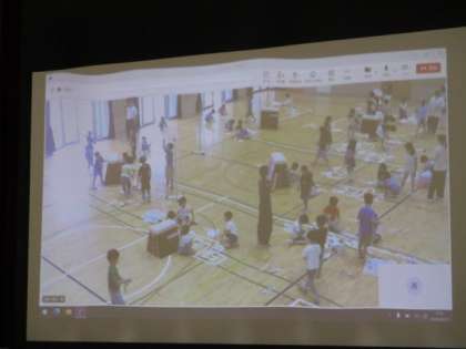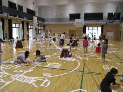 2Fに設置したカメラで体育館の床の全体像を俯瞰的にとらえ、ステージ上のスクリーンに映し出しました。子ども達は様々な形の紙を並べたりつなげたりしていきます。新聞紙もたくさん用意し、思い思いの造形も楽しむことができるように設定しました。